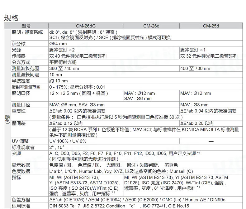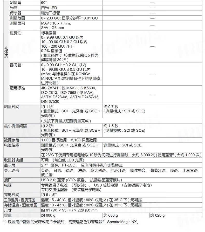 | 器间差 | 0 - 9.99 GU: ±0.2 GU 以内 10 - 99.99 GU: ≤ 0.5 GU 以内 (MAV; 与标准样件在 KONICA MINOLTA 标准测量条件下的测量值进行比较 ) | — | ||||