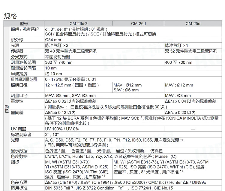 CM-25cG与其上一代CM-2500c机型兼容,其完善的环形照明光学系统(定义为45°c:0°)无论测量方向如何,均可达到较高的精度和重复性,尤其是在纹理或结构化表面。CM-25cG不仅可测量色彩,同时还可测量60°光泽度,并且,CM-25cG不仅可测量标准MAV尺寸(7mm),还可测量3mm直径小面积测量区域。