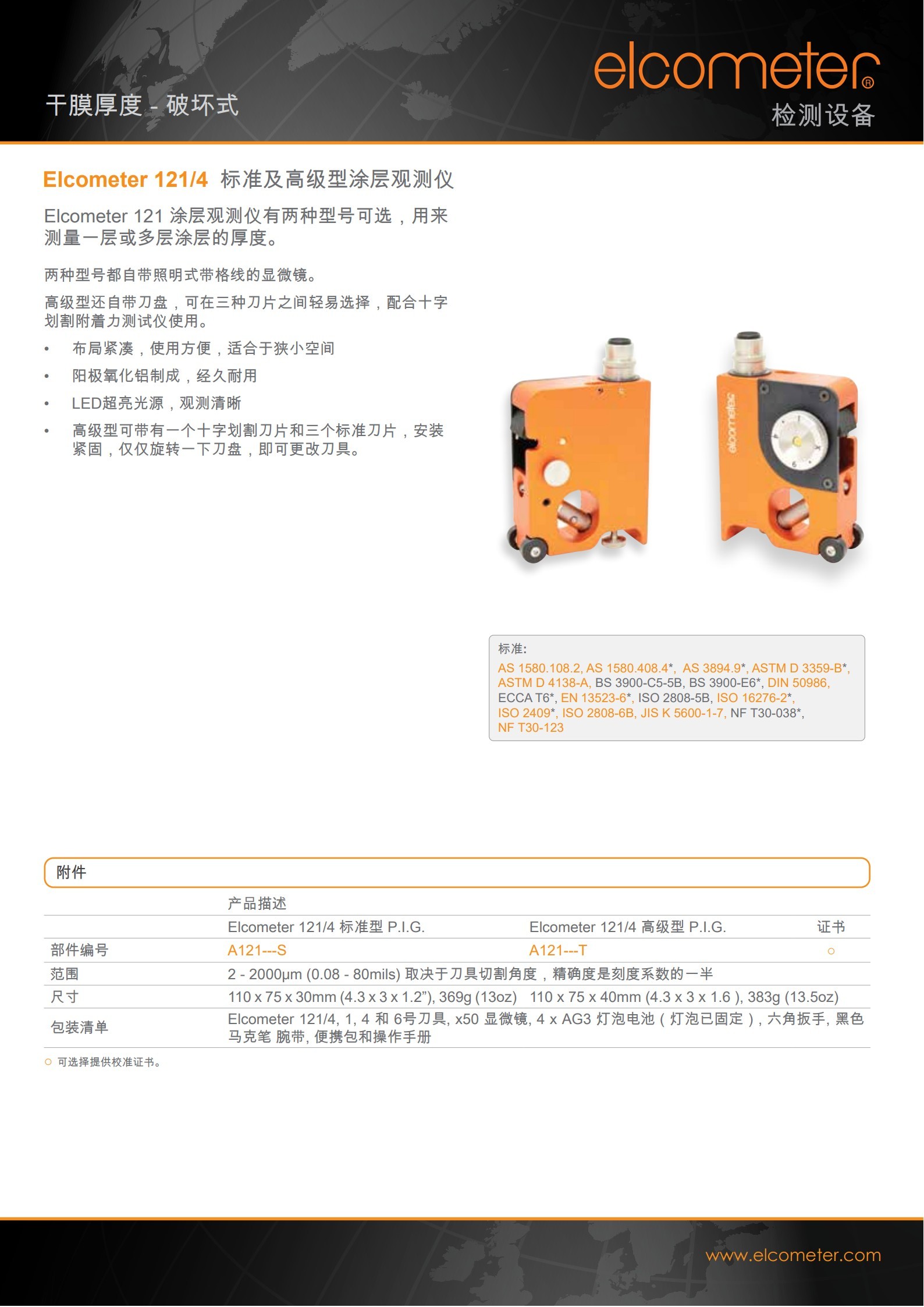 包装清单 | Elcometer 121/4, 1, 4 和 6号刀具, x50 显微镜, 4 x AG3 灯泡电池(灯泡已固定), 六角扳手, 黑色马克笔 腕带, 便携包和操作手册 | ||