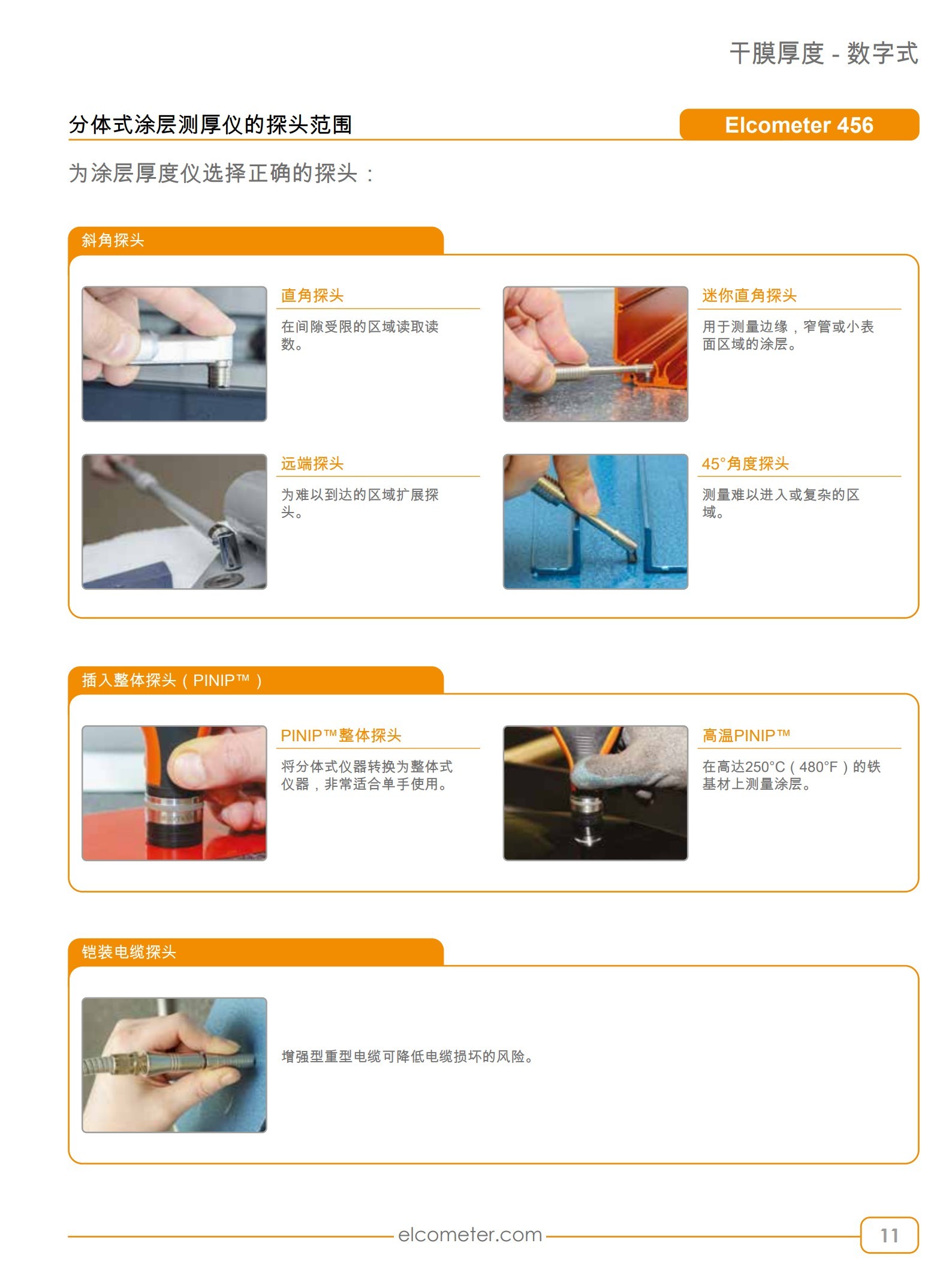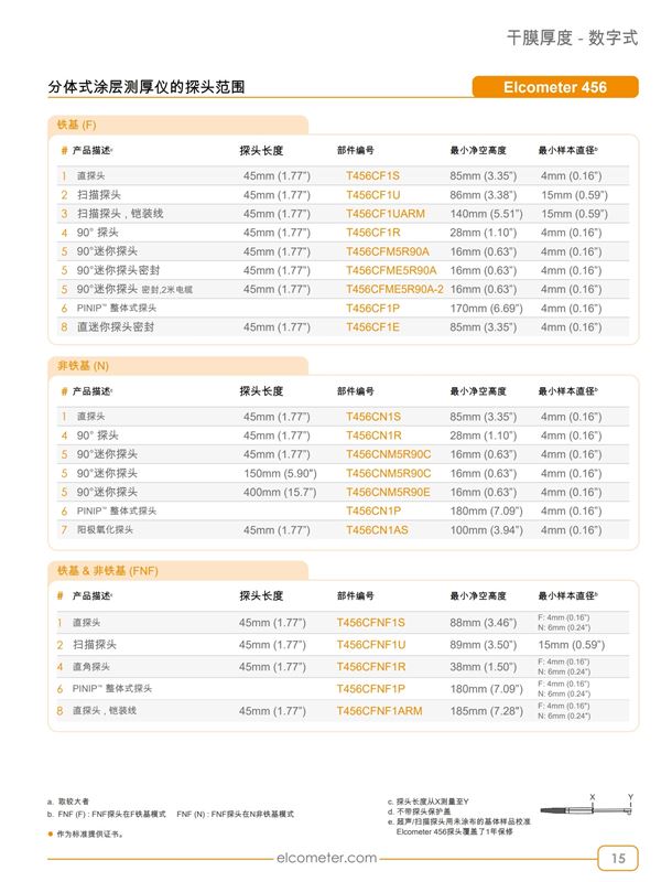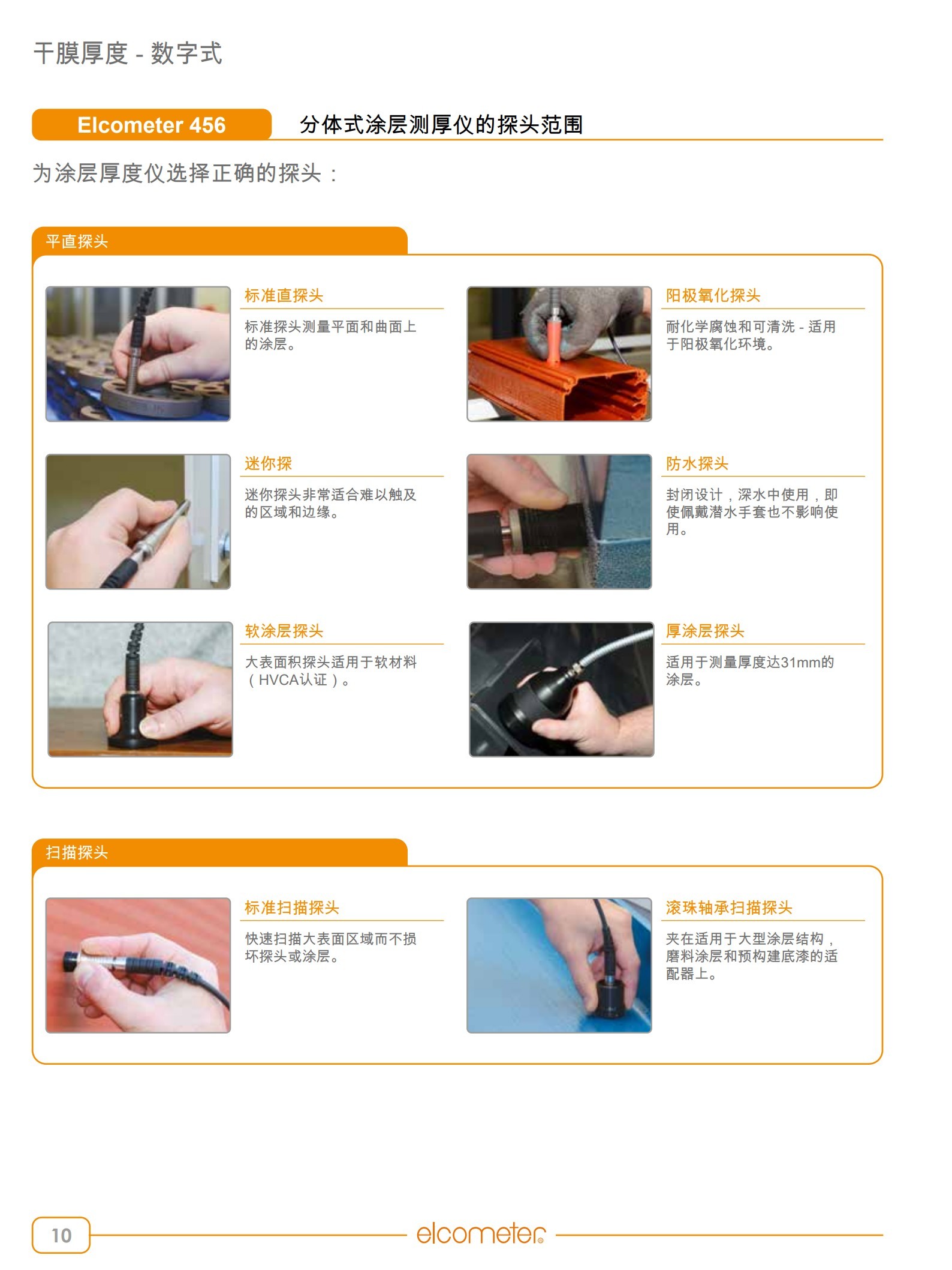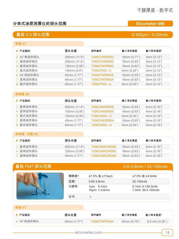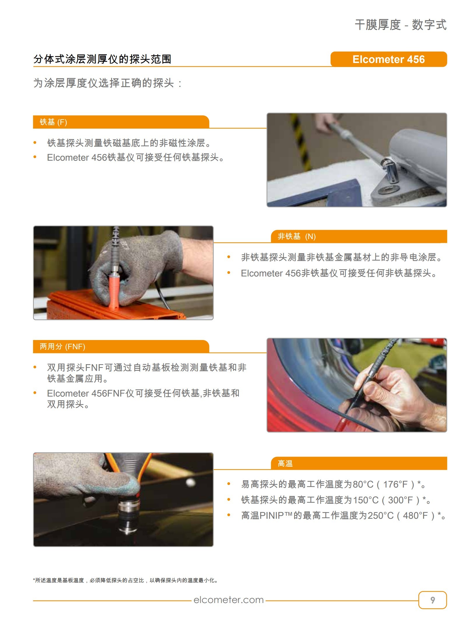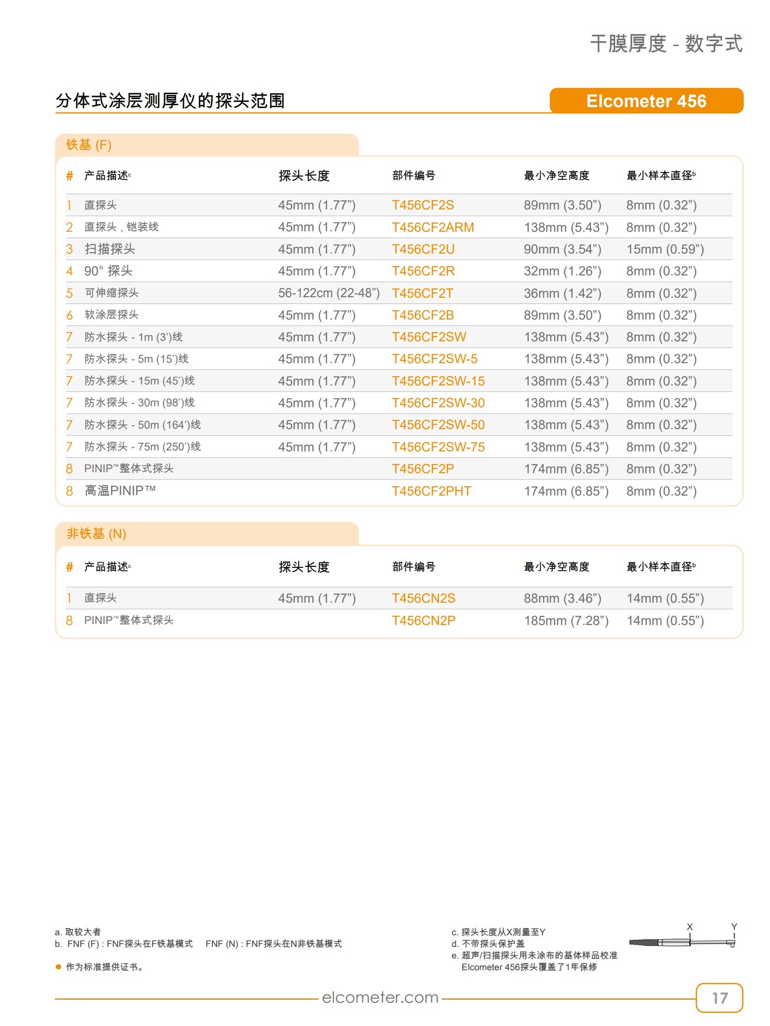 为满足客户的特定应用要求,所有的Elcometer 456探头*可互换, 且提供大量的设计与刻度范围。铁基探头测量铁磁基体上的非磁性涂层厚度。 Elcometer 456铁基类仪器认可任何铁基探头。 非铁基探头测量非铁基金属 基体上的非导电涂层厚度,Elcometer 456非铁基类仪器认可任何非铁基探头。 两用FNF探头可同时用于铁基和非铁基应 用,具有自动识别基体功能。 Elcometer 456 FNF类仪器认可所有铁基、非铁基以及两用FNF探头。