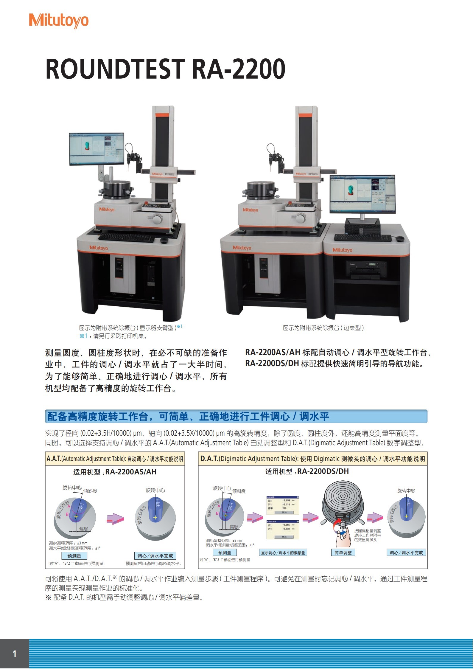 •操作简便的高精度转台 径向的旋转精度要高于0.02+3.5H/10000µm, 而在轴向精度达到0.02+3.5X/10000µm。 不仅保证圆度或圆柱度的高精度测量 而且还能保证平面度的高精度测量。 RA-2200AS/AH 采用具有自动调心和调水 平功能,这样操作者无需进行手动调心 和调水平操作。此外,RA-2200DS/DH型 号的指导系统作为标准特性,帮助未经 培训的操作者简单顺利地进行调心和调 水平操作。