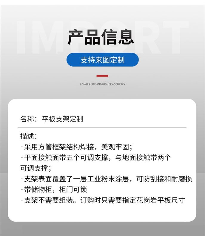 1、做为花岗石平台的辅助工具,理石平台的支架的地位是相当大的,它可以保证花岗石平板的平稳