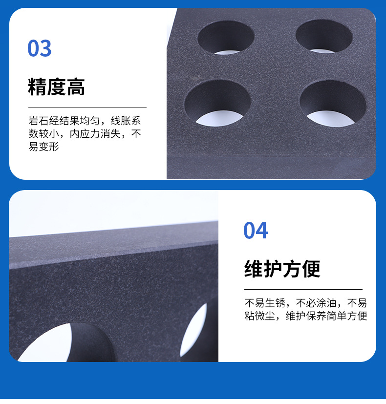 花岗石平板是用天然的石质材料制成的精密基准测量工具,对仪器仪表、精密工具、机械制件的检验,都是理想的基准面。特别是用于高精度的测量方面,由于它得天独厚的特性,而使铸铁平板相形见拙。花岗石取材于地下优质的岩石层,经过亿万年自然时效,形态极为稳定,不用担心因常规的温差而发生变形。经严格物理试验和选择的花岗石料,结晶细密,质地坚硬,抗压强度达2290-3750公斤/平方厘米,硬度达莫氏硬度6-7级。极耐磨损、耐酸、耐碱,有很高的耐腐蚀性,永远不会生锈。由于花岗石系非金属材料,*磁性反应,也无塑性变形。其硬度比铸铁高2-3倍(相当于HRC>51),因此精度保持性好。在使用中岩石工具即使遭重物磕碰,至多掉几粒石碴而已,而不会像金属工具那样,因变形而破坏精度。其优于优质铸铁和钢材制作的精密测量基准零件,可以获得高而稳定的精度.