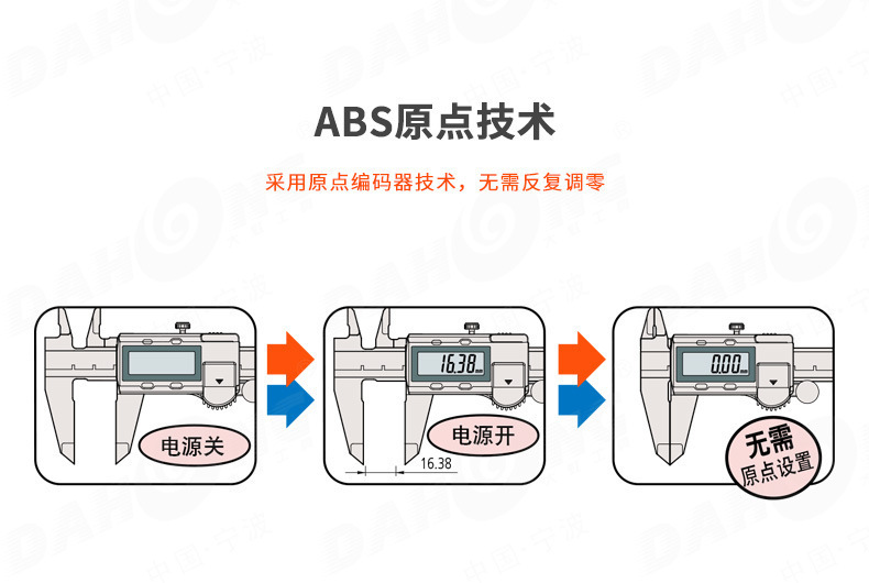 三丰原点型 Digimatic 卡尺品。它可对所设置的原点位置进行持续跟踪。开机液晶显示屏会显示出当前副尺位置,以便随时进行测量。采用ABS编码器技术,无需反复调零,也不会产生超速错误。