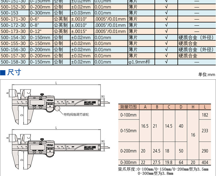 货号 | 测量范围(mm) | 深度测量杆 | 拇指调节滚轮 | 其它 | 备注 |