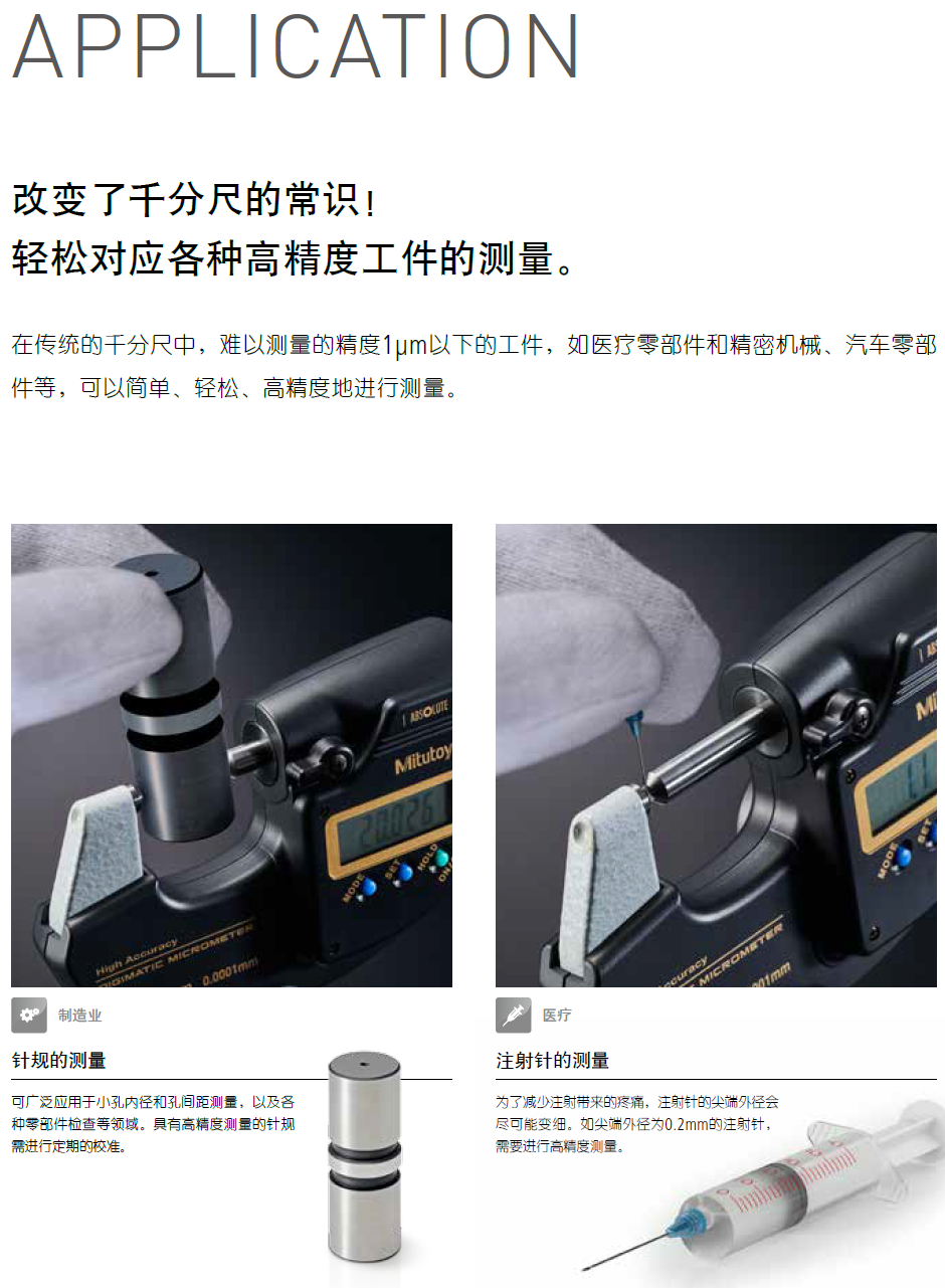 ● 本款千分尺分辨力为0.1μm,是需要用手持式工具进行高精度测量顾客的理想选择。