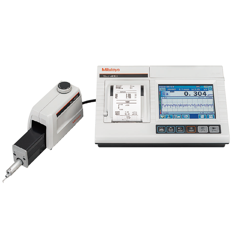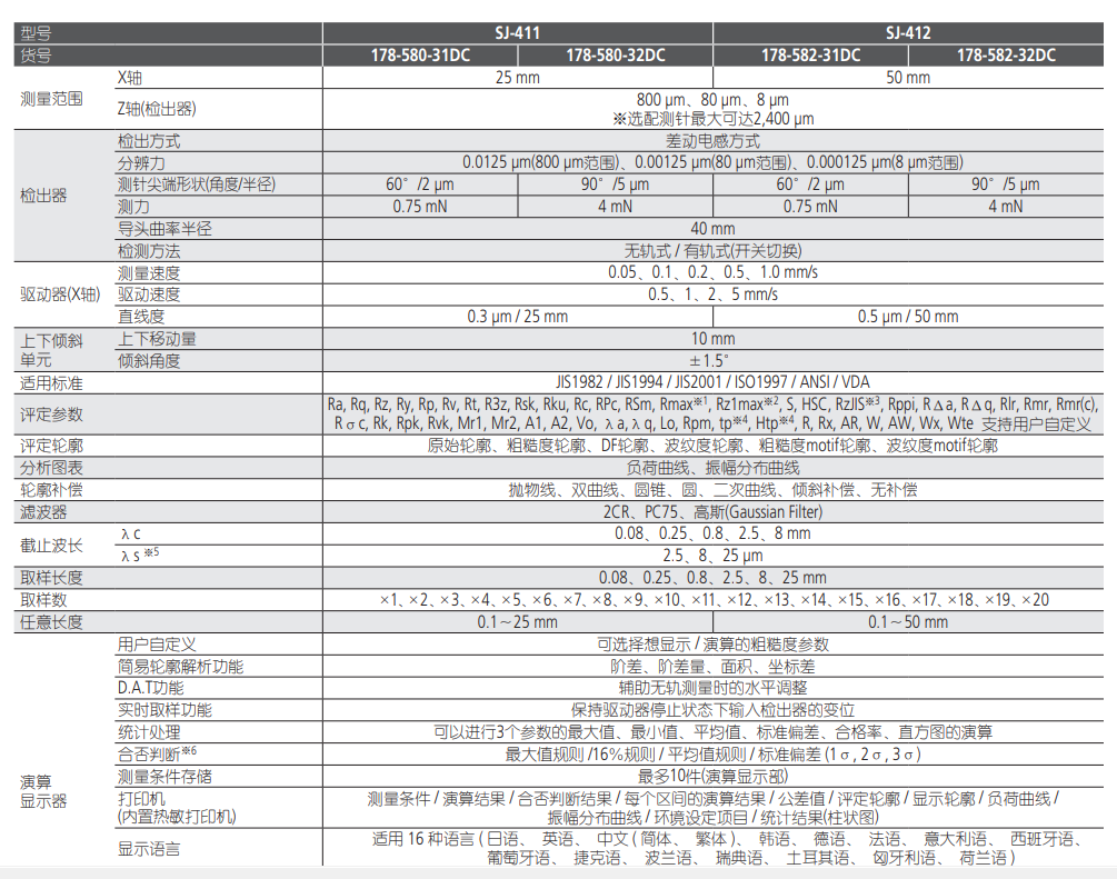 三丰Mitutoyo SJ-410粗糙度仪---能够适用在检测室、加工车间、生产现场等场合Surftest (表面粗糙度测量仪) 。SJ410系列粗糙度仪支持有轨和无轨两种测量。配备46个符合新的ISO、DIN、ANSI、JIS标准的粗糙度参数。配备一个宽范围、高分辨率的检出器和一个驱动器,提供了在同类产品中的测量。(测量范围/分辨率>800µm/0.0125µm分辨率 (8µm测量范围) <直线度/移动长度 ) sj-411驱动部 : 0.3µm/25mm,sj-412驱动部:0.5µm/50mm。无轨检出器和弧形表面补偿功能使它能有效地评价圆柱体表面粗糙度。特细的阶差,直线度、波纹度均可用无轨测量功能测出。手持便携式数据处理单元和5.7英寸彩色图形lcd触摸面板,提供可读性和可操作性。LCD还具有背光功能,提高了黑暗环境中的可见度。测量数据可通过RS-232C接口电缆 (选件) 由外部PC输出。