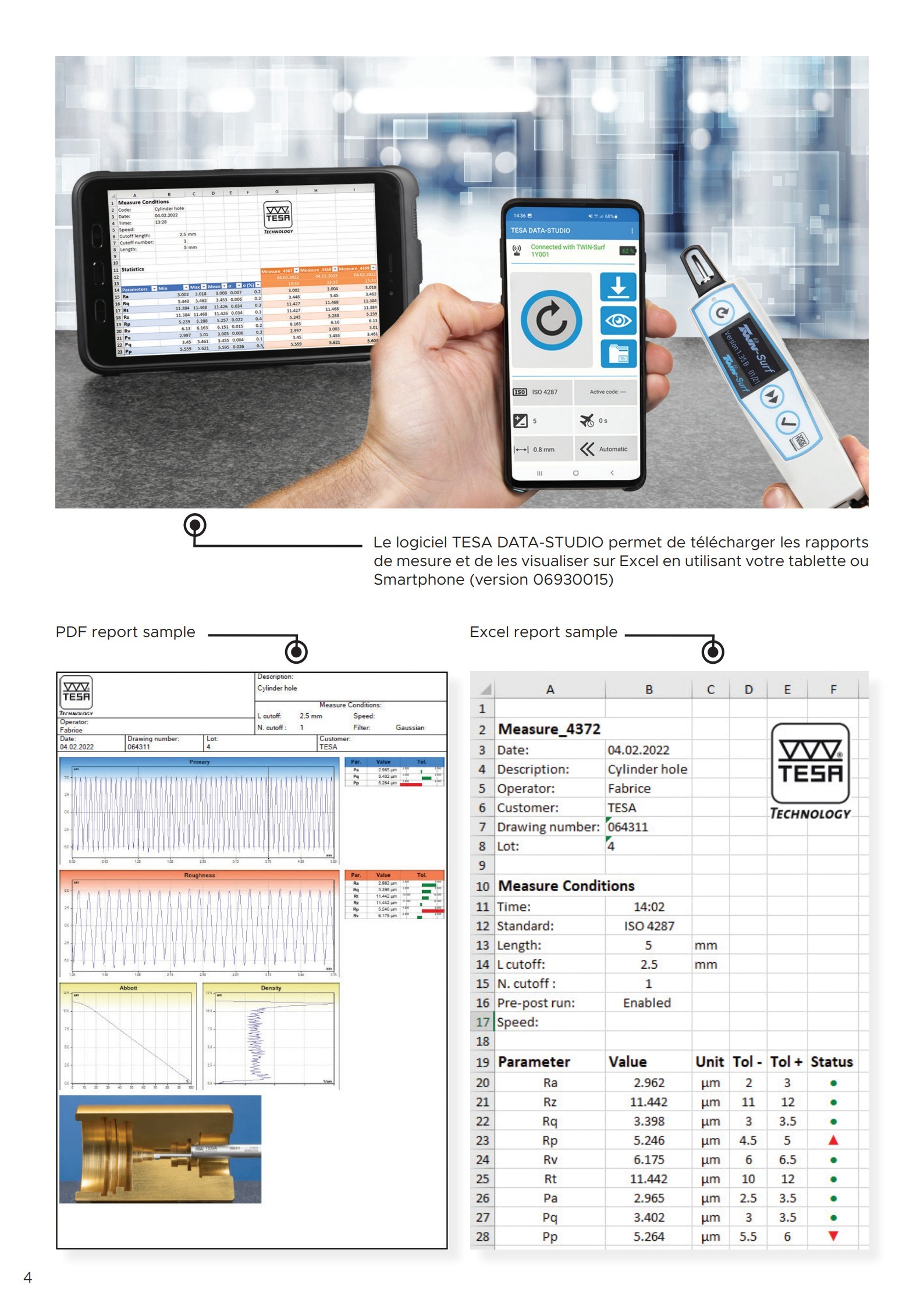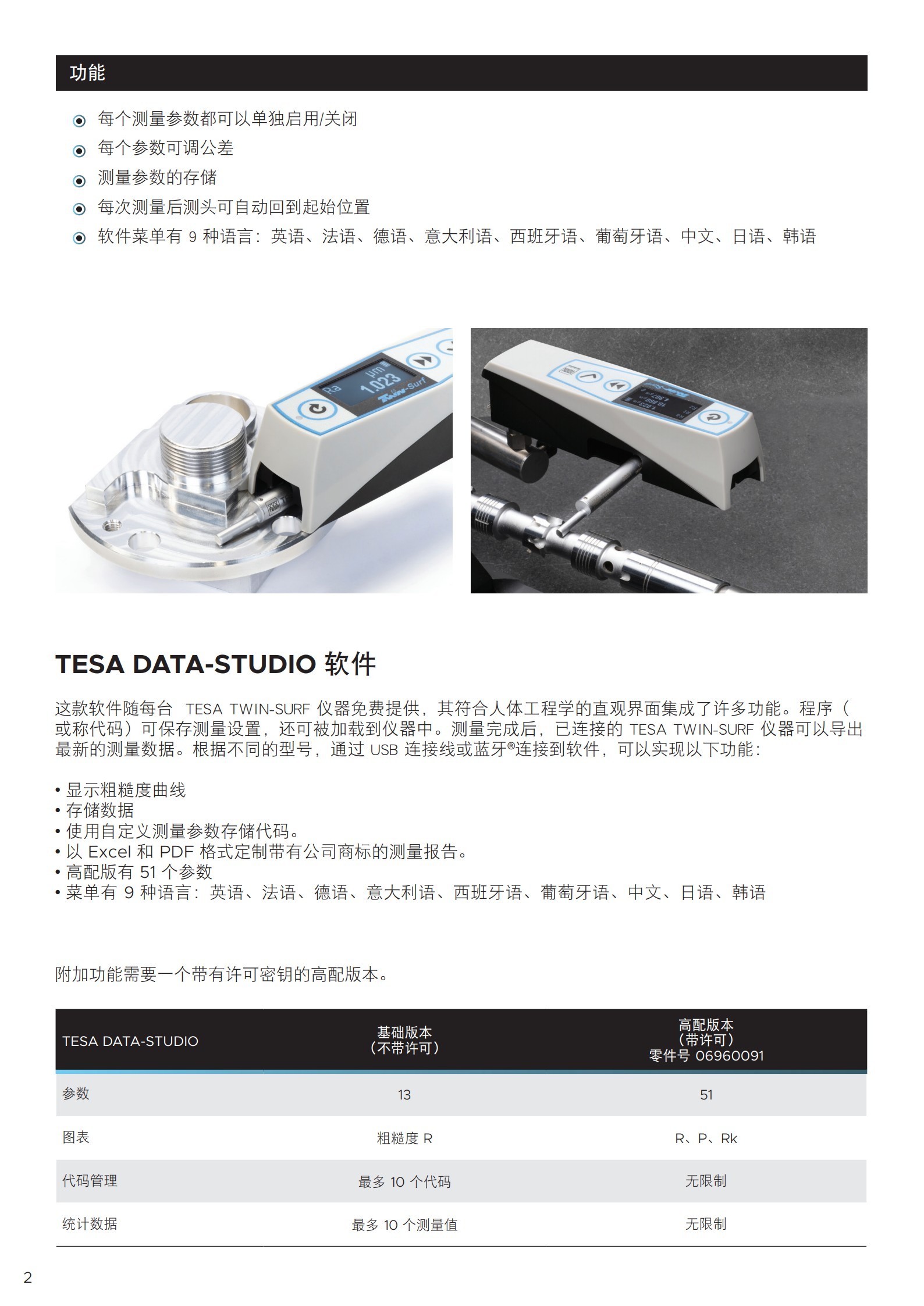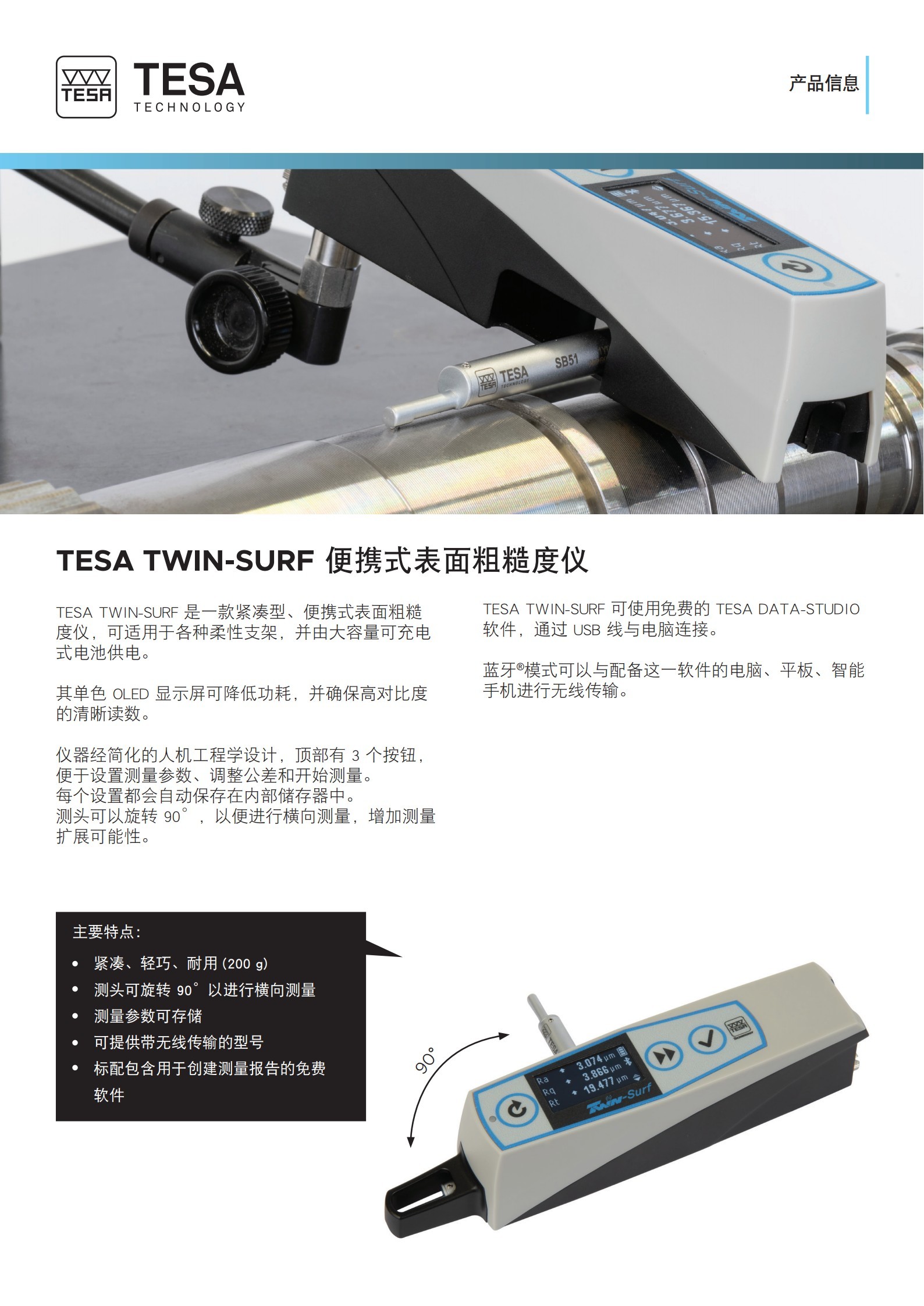 仪器硬件- 超紧凑、便携且坚固- 高对比度显示适合在黑暗环境的舒适读数- 仪器顶部的 3 个按键方便配置操作- 可互换的测头• 供电- 可以用电源或电池操作• 测量- 适用于生产车间或进货检验- 使用 100 mm 测头延长杆 (选配),可以进入狭窄和较深的位置- 测头可旋转 90° 以进行横向测量• 功能 (使用 DATA-STUDIO, 基础版)- R-轮廓显示- 具备 13 种粗糙度参数- 可统计处理 10 次测量- 可存储 10 个测量程序- 每种参数可单独激活- 每个参数都能单独设置公差• 数据管理- 标准版经线缆连接到计算机- 蓝牙® 版通过无线连接到计算机、平板电脑或智能手机- 免费的 TESA DATA-STUDIO 软件 (基础版) 包含用于创建测量报告、统计管理、测量参数