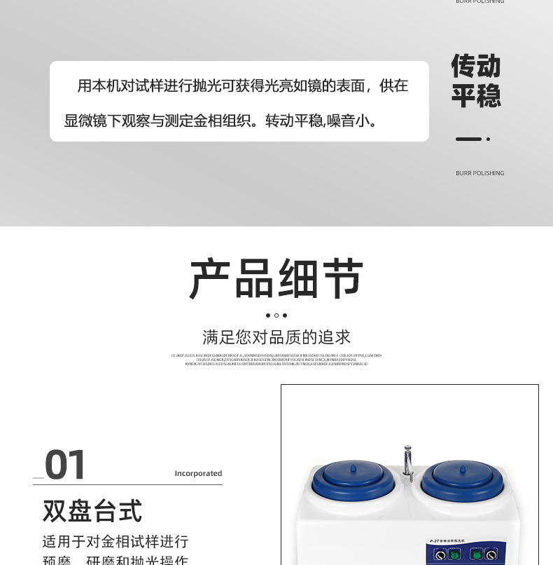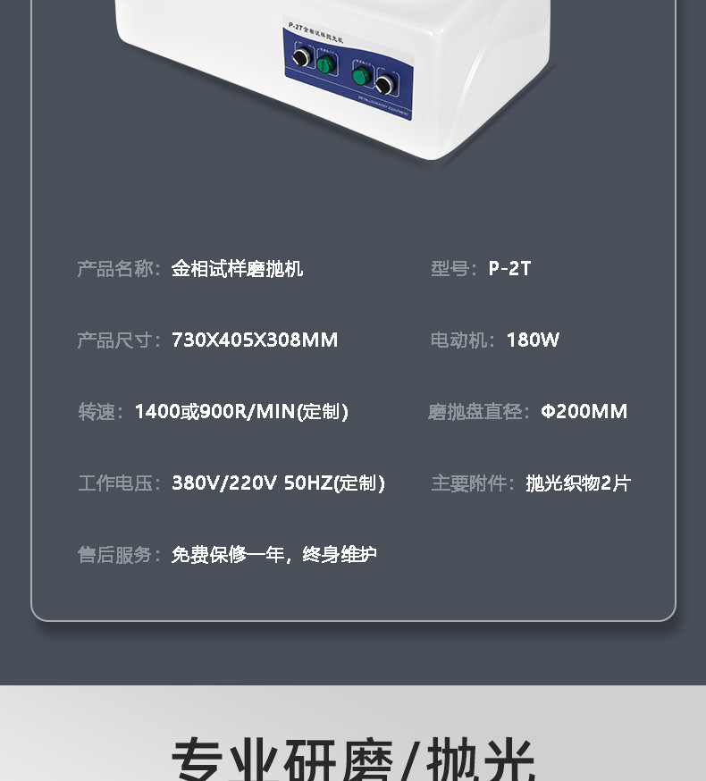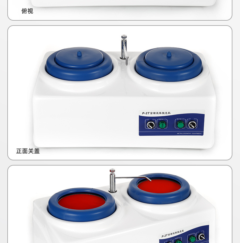 在金相试样制备过程中,试样的抛光是一道主要工序,经过磨光的试样,在抛光机上抛光后,可获得光亮如镜的表面,P-2T型金相试样抛光机是一款经典的抛光设备,它具有传动平稳,噪音小,操作、维修方便等优点,能适合更多种材料的抛光要求。该机适用于厂矿企业、大专院校、科研单位的金相试验室。