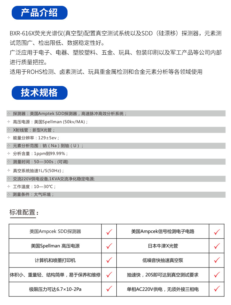 BXR-616是BXR-606型的升级版,更好地应对RoHS、无卤等环保指令,配置了真空测试系统,加了元素测试范围,探测器配备SDD的测试系统,特别是提高了Na、Mg、Al、Si等轻元素的检出限,精确度提高了,同时在测试Cd/Pb/Cr/Hg/Br/Cl等其他元素的重复性稳定性有了明显的提高。