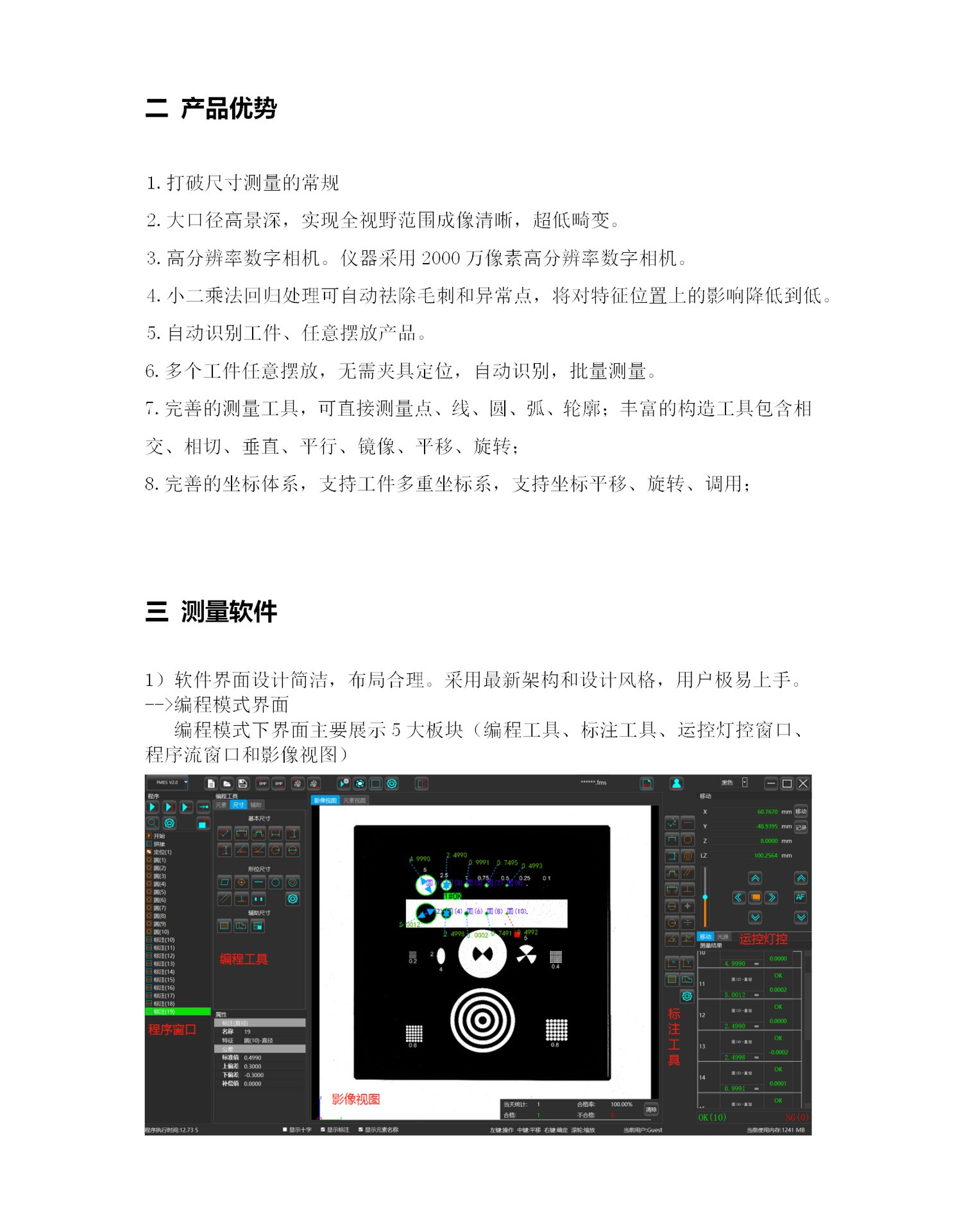 1、高分辨率镜头,1%亚像素图像处理,高精度算法分析;
