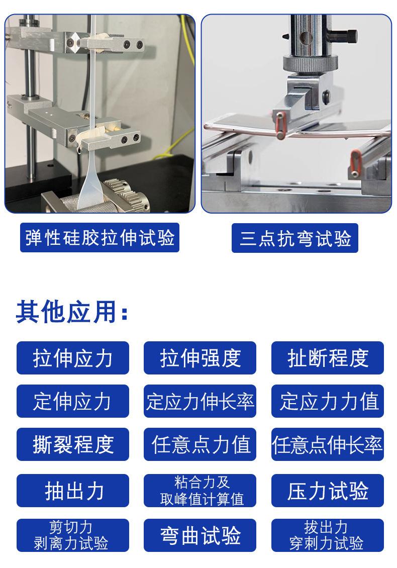 本机主要用检测金属、非金属材料产品的拉伸、抗压缩、剥离、撕裂、抗弯曲、三点抗折、抗剪切等物理性能。同时可根据GB、ISO、JIS、ASTM、DIN及用户提供的多种标准进行试验和数据处理。