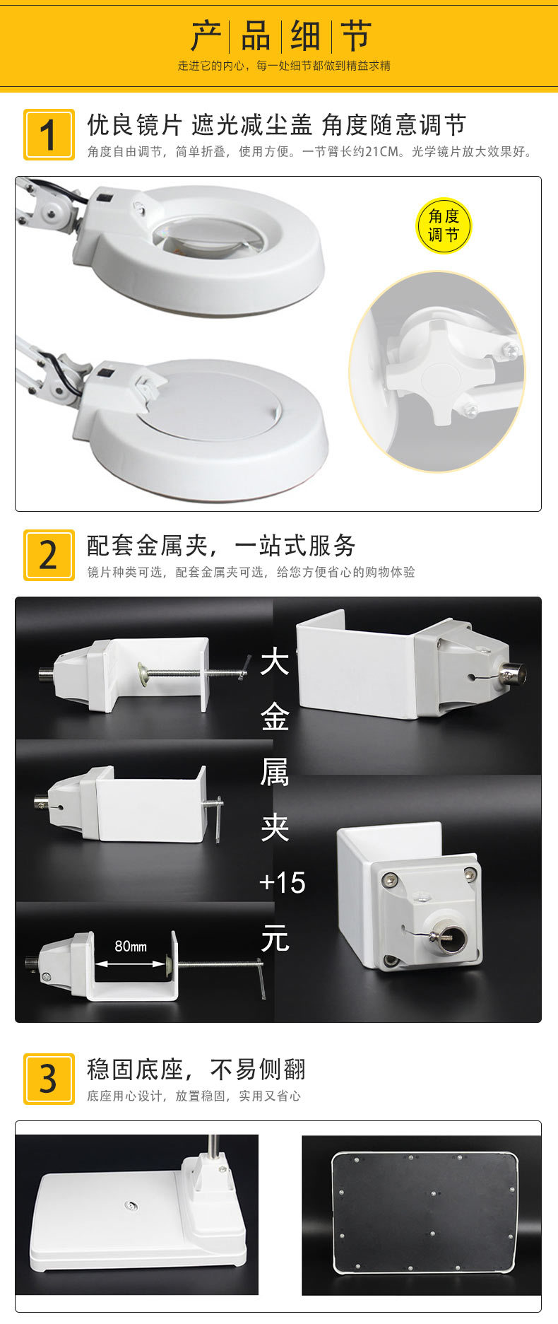 改变放大镜的方向和位置时,如果调节臂锁紧钮太紧,请稍稍放松,待调整好位置和方向后,再拧紧。千万不可强行拉动,以免损坏部件。