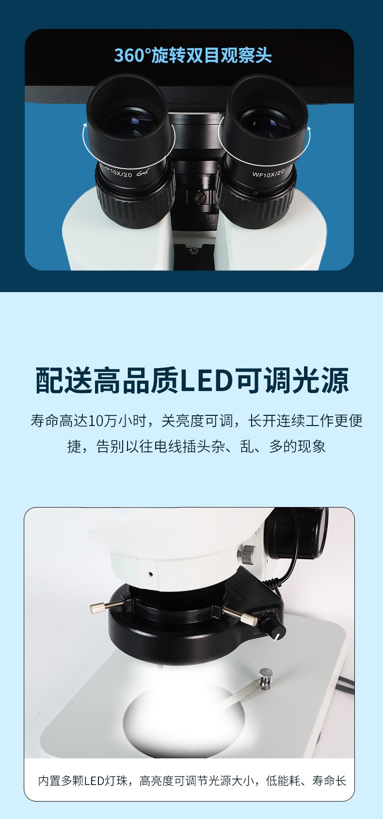 三通观察头,30°倾斜,固定式分光比(双目 :三目 =50:50),瞳距调节范围 50-76mm,固定式目镜筒,带目镜锁紧装置 | |