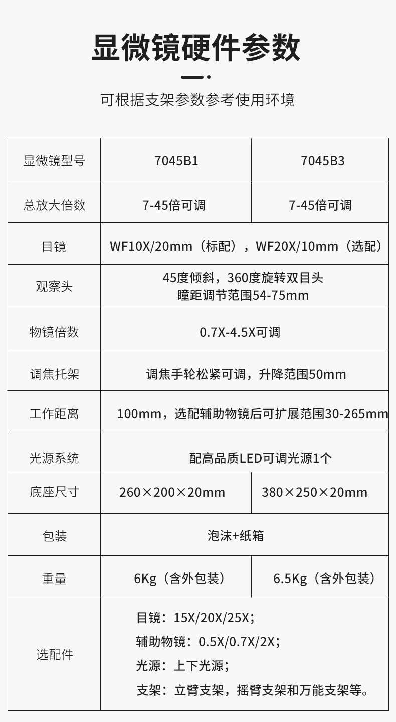 放大倍数 | 标准配置:7X-45X 选配目镜和辅助物镜可扩展至3.5X-270X,连续变倍 | |||||||