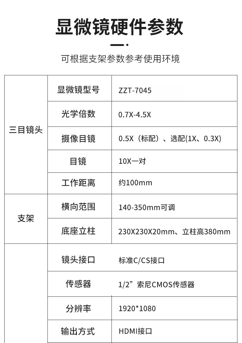 三目镜头 | 光学倍率 | 0.7X-4.5X |