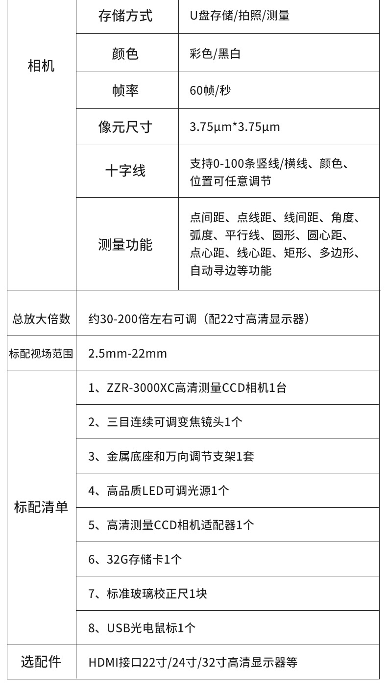 标配清单 | 1、ZZR-3000XC高清测量CCD相机1台; 2、三目连续可调变焦镜头1个; 3、标准底座和可调支架1套; 4、高品质LED可调光源1个; 5、高清测量CCD相机适配器1个; 6、32G存储卡1个; 7、标准玻璃校正尺1块; 8、USB光电鼠标1个; | |