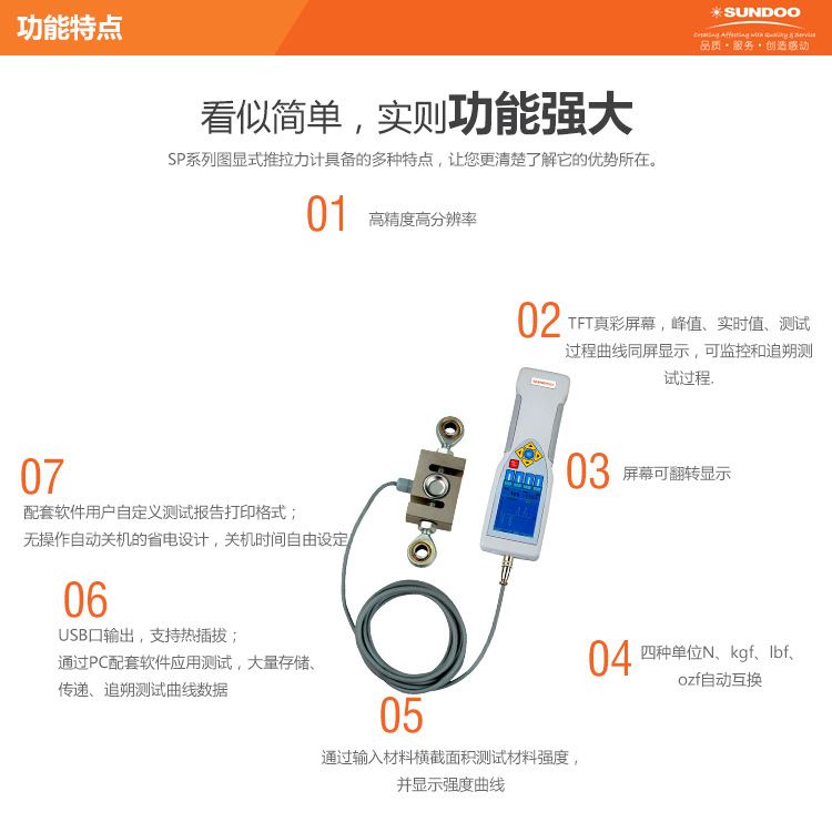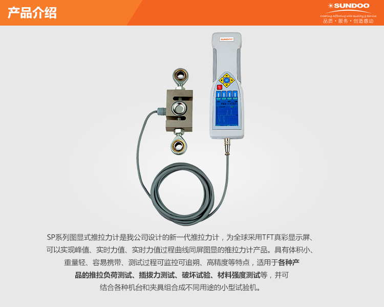 SP系列图显式推拉力计是我公司设计的新一代推拉力计,采用TFT真彩显示屏,峰值、实时力值、实时力值过程曲线同屏图显的推拉力计产品。具有体积小、重量轻、容易携带、测试过程可监控可追朔、高精度等特点,适用于各种产品的推拉负荷测试、插拔力测试、破坏试验、材料强度测试等,并可结合各种机台和夹具组合成不同用途的小型试验机。