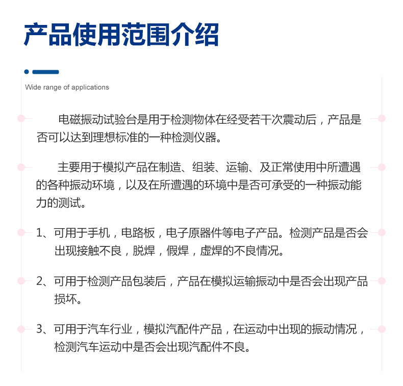 本电磁振动试验机为专门针对被测物体经受若干次震动后是否可以达到理想标准的一种测试,振动试验机是提升您跃入高品质领域的利器,模拟产品在制造,组装运输及使用执行阶段中所遭遇的各种振动环境,用以鉴定产品是否忍受环境振动的能力,主要用于线路板, 电子原器件,电源会不会接触不良,脱焊,假焊等。