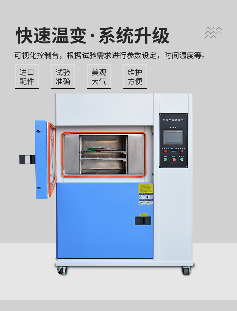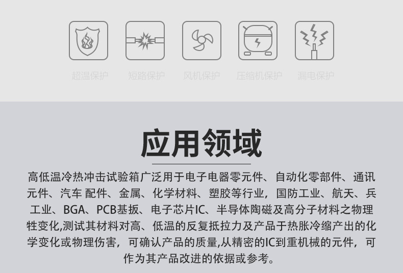 冷热冲击试验箱广泛用于电子电器零元件、自动化零部件、通讯元件、汽车配件、金属、化学材料、塑胶等行业,国防工业、航天、兵工业、BGA、PCB基扳、电子芯片IC、半导体陶磁及高分子材料之物理牲变化,测试其材料对高、低温的反复抵拉力及产品于热胀冷缩产出的化学变化或物理伤害,可确认产品的质量,从精密的IC到重机械的元件,可作为其产品改进的依据或参考。