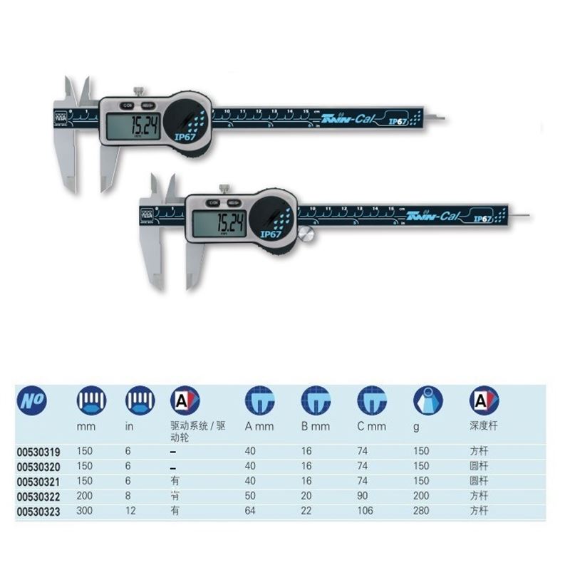 | 00530323 | 通用数显卡尺, 300 mm, TWIN-CAL IP67, 方杆, 带拇指轮 |