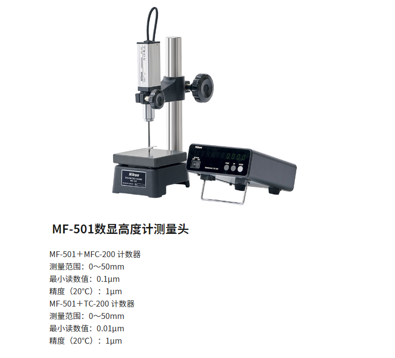 有3种测量头可供选择。还有各种计数器、底座、测头等,可以满足各种测量需求。