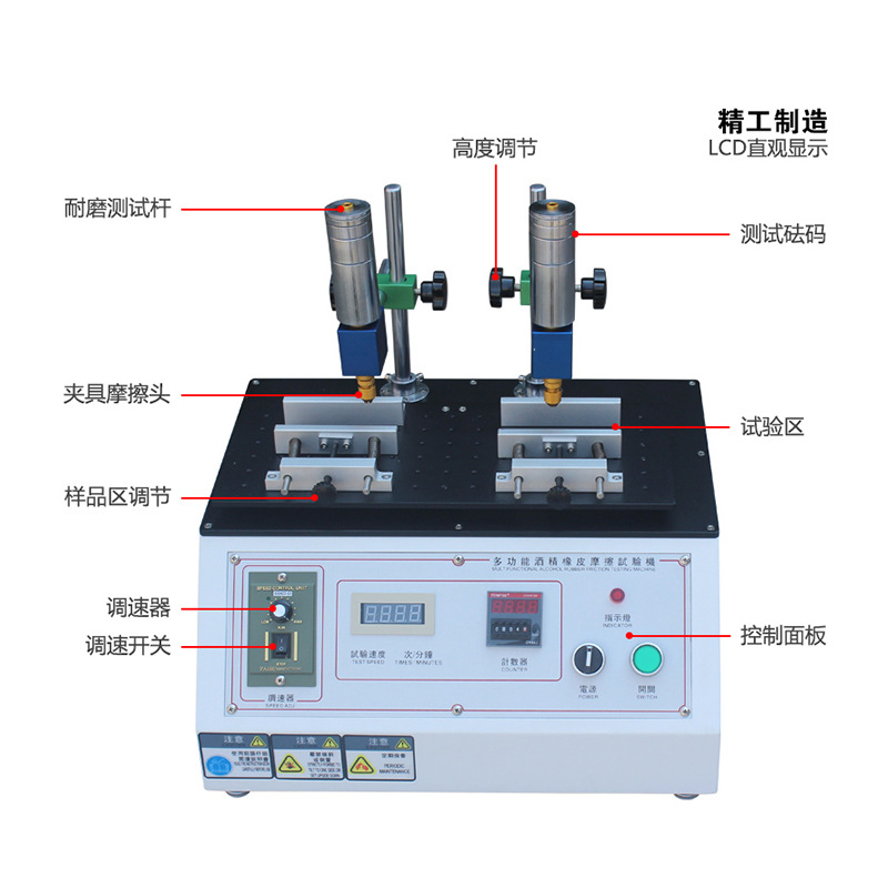 酒精磨擦试验机摩擦头有三种,分别为酒精耐磨、橡皮耐磨、铅笔耐磨;若是产品需要把摩擦头换成钢丝绒的头来磨产品也是可以的。