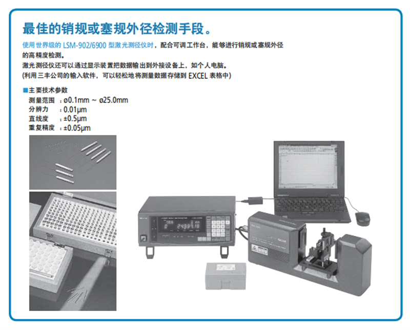 射外径测定机用高速扫描光素可以测量於传统仪器难以测量的工作,如易碎或弹性零件,零件,需保持清结的零件,和在测量力作用下变形的零件,透明零件也可以测量。