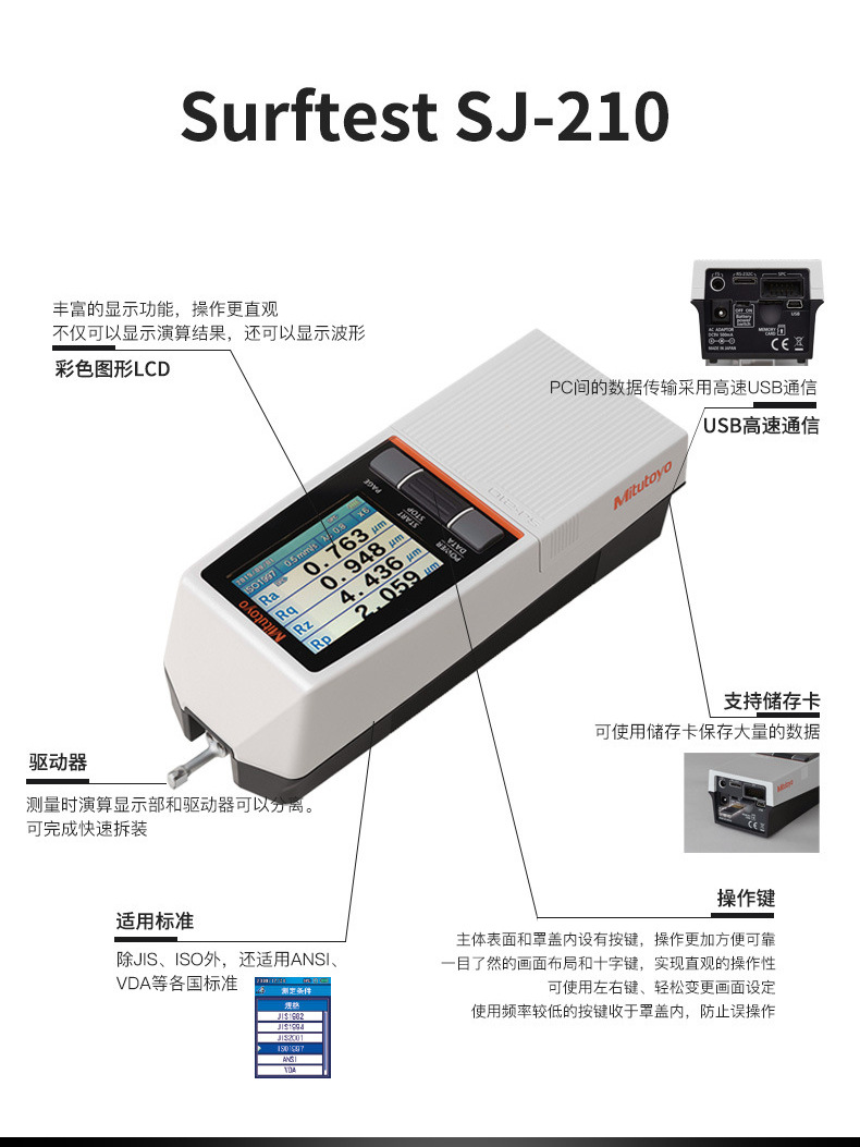SJ-301P精心创造的便携式表面粗糙度测量仪,能够满足您的各种测量需要。JIS/DIN/ISO/ANSI兼容36个评价参数和3个分析图表。