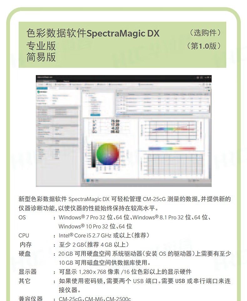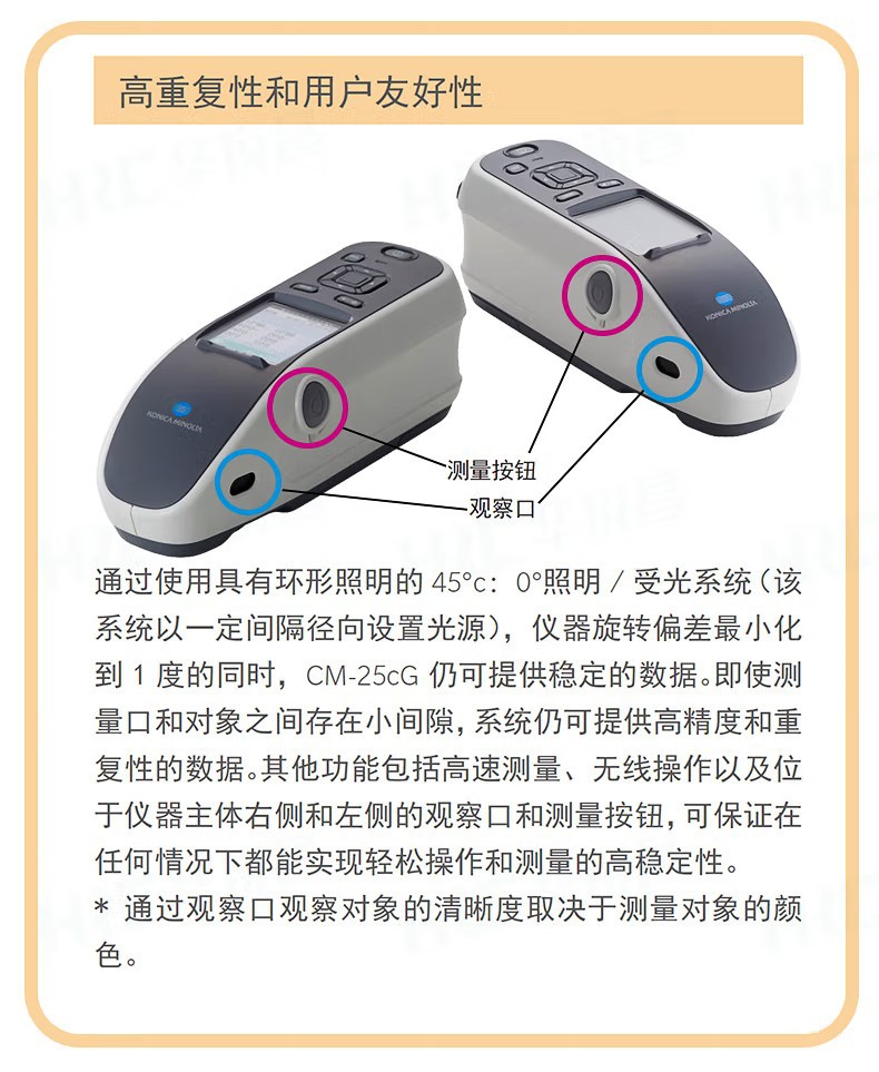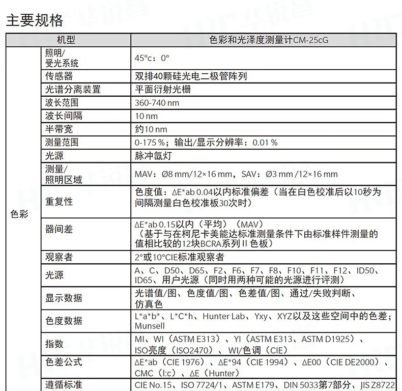 CM-25cG与其上一代CM-2500c机型兼容,其完善的环形照明光学系统(定义为45°c:0°)无论测量方向如何,均可达到较高的精度和重复性,尤其是在纹理或结构化表面。CM-25cG不仅可测量色彩,同时还可测量60°光泽度,并且,CM-25cG不仅可测量标准MAV尺寸(7mm),还可测量3mm直径小面积测量区域。