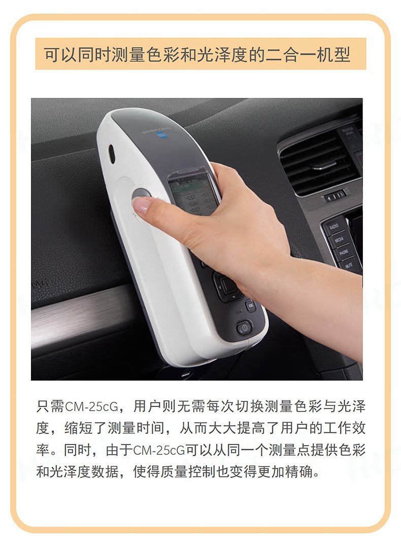 新型CM-25cG是汽车行业内用于测量汽车内饰的标准机型CM-2500c的换代产品。CM-25cG是一款更小巧轻便的便携式分光测色计,采用了45°c:0°几何光学结构并配备高性能60°光泽传感器。此款仪器所使用的45°c:0°几何光学结构以能够提供与视觉感知极度相关的色值而闻名。这一点可以通过排除纹理表面的镜面光效果来实现。内置光泽传感器可精确地测量表面光泽度。