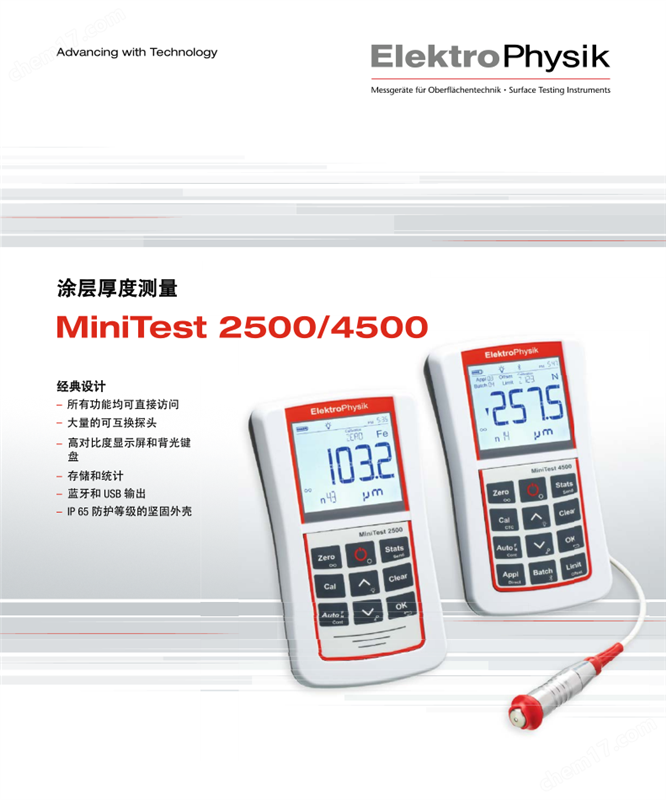 MiniTest涂层测厚仪不仅适用于实验室,而且还由于其坚固耐用的IP65防护等级,所以同样适用于工业应用。MiniTest 4500 配备USB输出,可连接笔记本电脑和台式电脑。 还提供蓝牙输出,用于无线数据直接传输 到移动设备,如智能手机和打印 机。所有主机功能都可以直接按下发光键盘上的一个按键来触发。符合人体工程学设计的带有背光照明的大型显示屏可提高用户的舒适度和。MiniTest2500/ 4500系列涂层测厚仪提供多种测量探头,使其可以处理标准应用以及更复杂的测量任务。应用范围由连接到主机的探头决定: