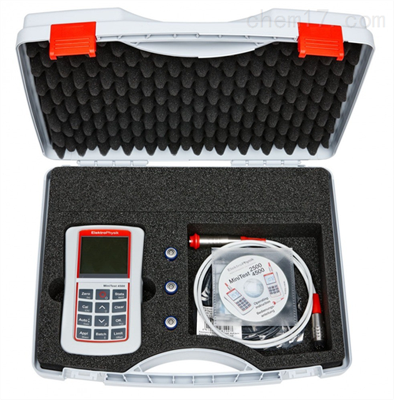 标准配置:MiniTest 2500 或 4500、塑料便携箱、橡胶保护套、 操作手册 德文,英文, 法文、 3 x AA 电池、 USB 连接线、 已选的涂层测厚仪探头、一套校准标准,包括校准箔和零标准板
