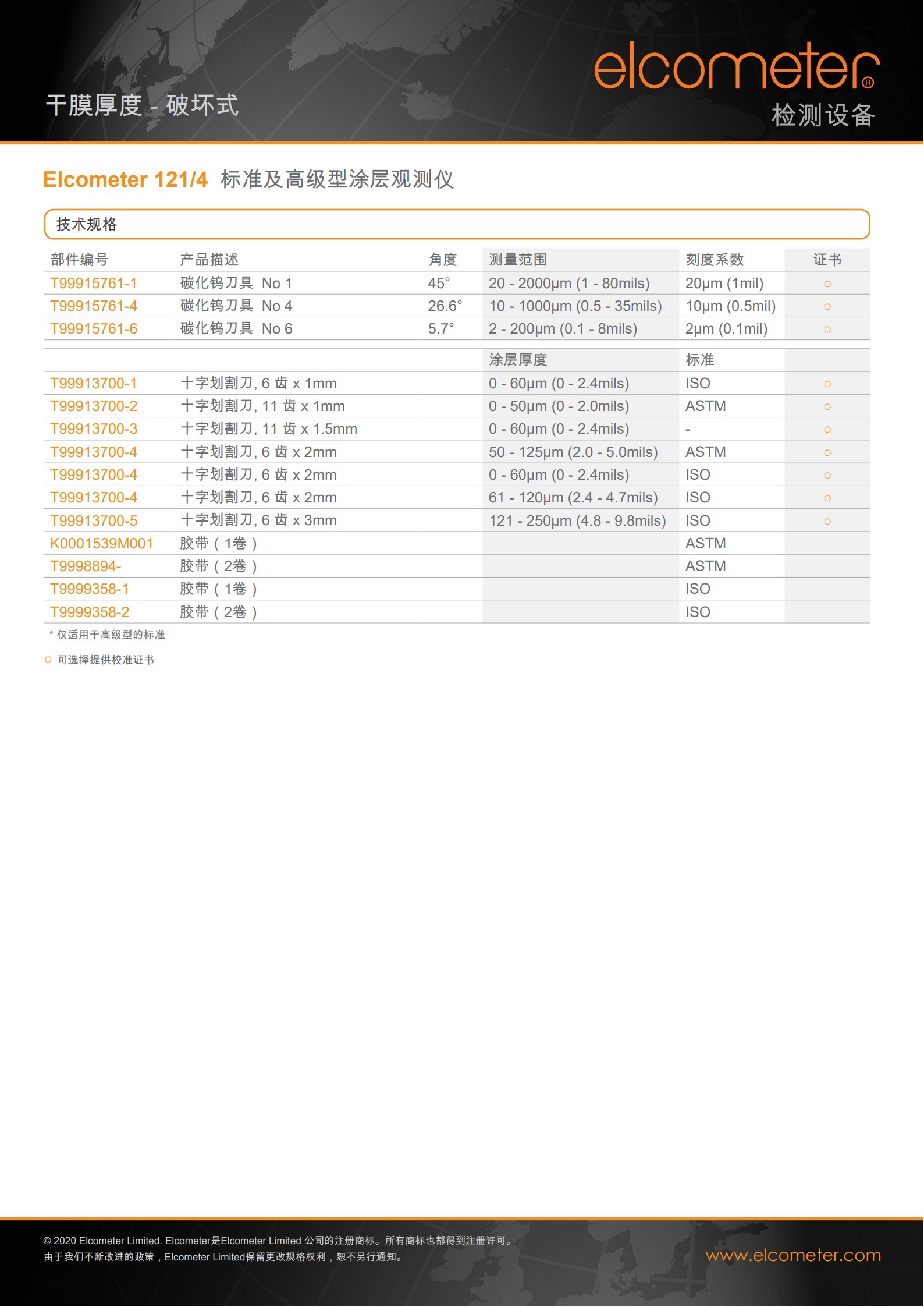 包装清单 | Elcometer 121/4, 1, 4 和 6号刀具, x50 显微镜, 4 x AG3 灯泡电池(灯泡已固定), 六角扳手, 黑色马克笔 腕带, 便携包和操作手册 | ||