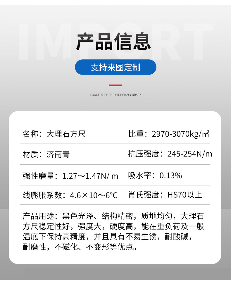 大理石方尺简介:大理石方尺精密量具采用优质“济南青"石料经机械加工和手工精磨制成。