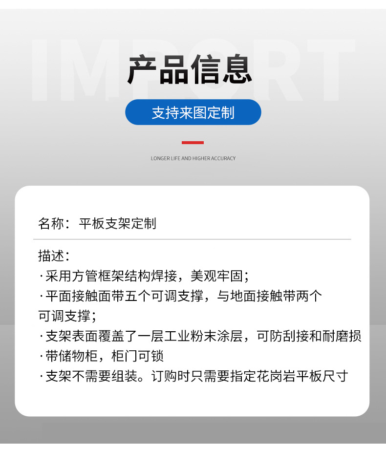 1、做为花岗石平台的辅助工具,理石平台的支架的地位是相当大的,它可以保证花岗石平板的平稳