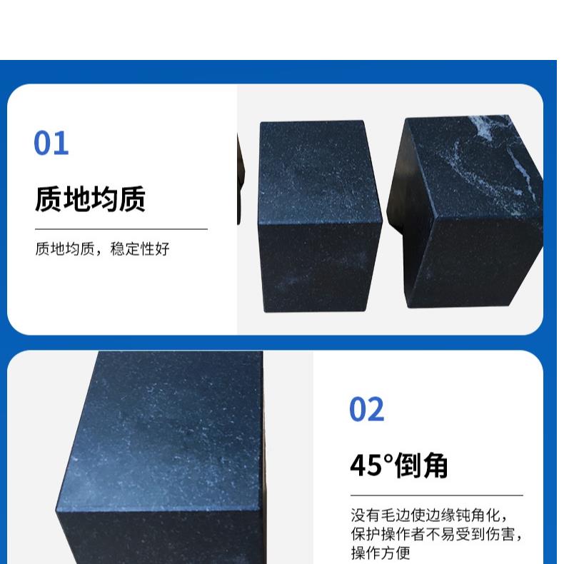 大理石 花岗石方箱又名花岗石平板是用天然的石质材料制成的精密基准测量工具,对仪器仪表、精密工具、机械制件的检验,都是理想的基准面。特别是用于高精度的测量方面,由于它得天独厚的特性,而使铸铁平板相形见拙。花岗石取材于地下优质的岩石层,经过亿万年自然时效,形态极为稳定,不用担心因常规的温差而发生变形。经严格物理试验和选择的花岗石料,结晶细密,质地坚硬,抗压强度达2290-3750公斤/平方厘米,硬度达莫氏硬度6-7级。极耐磨损、耐酸、耐碱,有很高的耐腐蚀性,永远不会生锈。由于花岗石系非金属材料,*磁性反应,也无塑性变形。其硬度比铸铁高2-3倍(相当于HRC>51),因此精度保持性好。在使用中岩石工具即使遭重物磕碰,至多掉几粒石碴而已,而不会像金属工具那样,因变形而破坏精度。其优于优质铸铁和钢材制作的精密测量基准零件,可以获得高而稳定的精度。