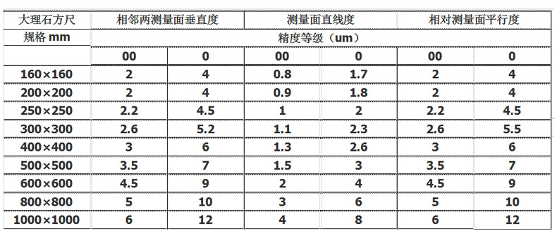 规格(mm) | 相领两测量面垂直度 | 测量面直线度 | 相对测量面平行度 | |||