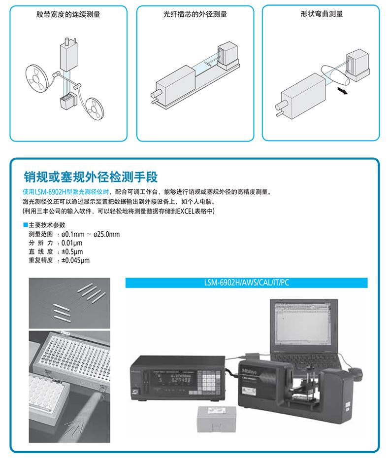 射外径测定机用高速扫描光素可以测量於传统仪器难以测量的工作,如易碎或弹性零件,零件,需保持清结的零件,和在测量力作用下变形的零件,透明零件也可以测量。