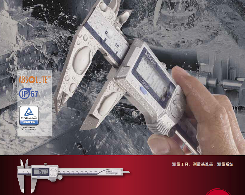 ●ABS防冷却液卡尺(标准型)的防水功能达到了IP67防护等级,即使在大量冷却液的环境下也能放心使用。所有产品均通过了空气泄漏测试,使用更安全、可靠。