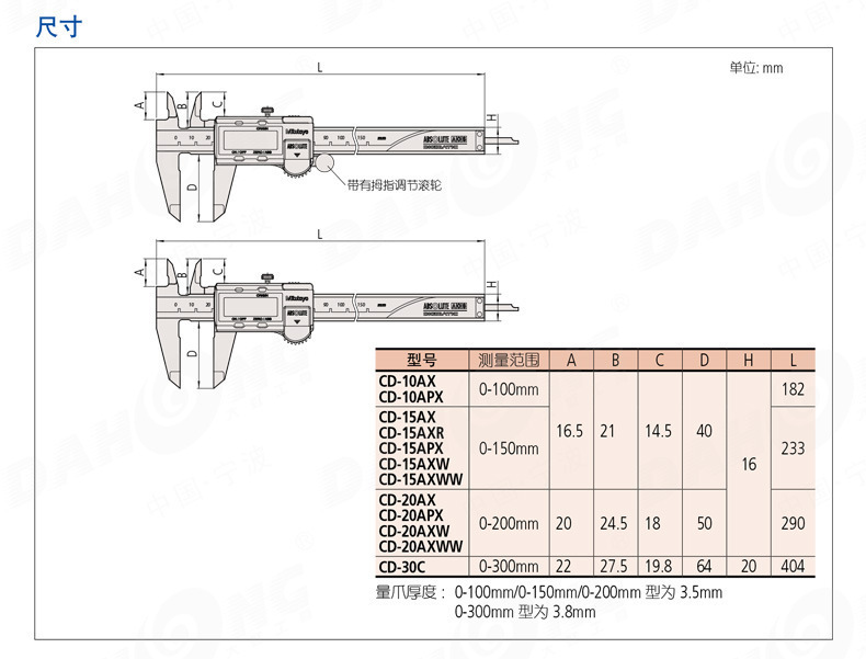 500-157-20 | 0-200 | 薄片 | 带有拇指调节滚轮 | 用于外径和内径测量的硬质合金头量爪 | 公制型 |