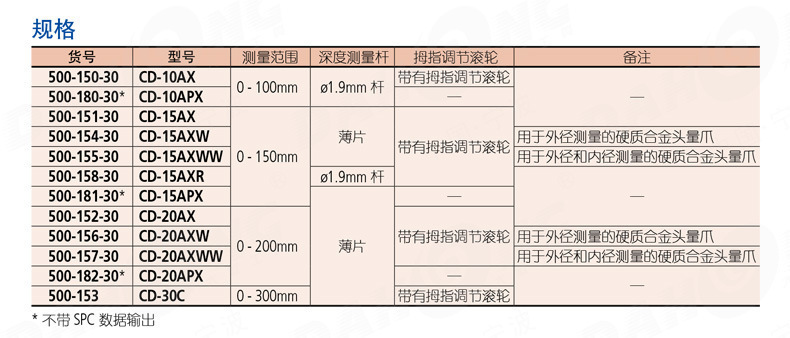货号 | 测量范围(mm) | 深度测量杆 | 拇指调节滚轮 | 其它 | 备注 |