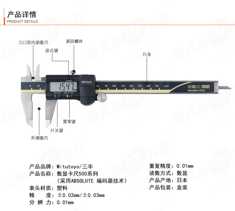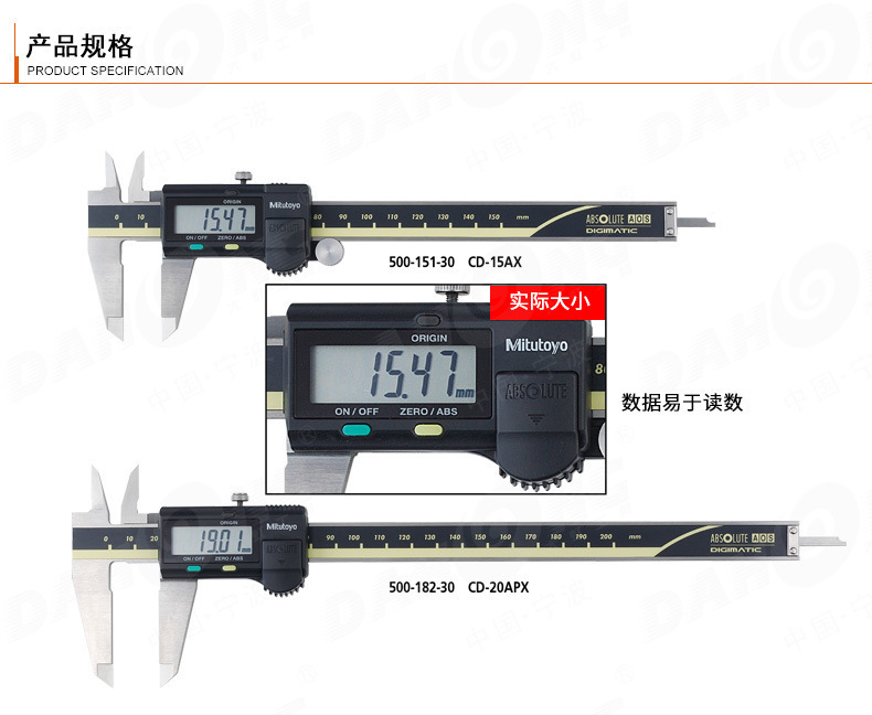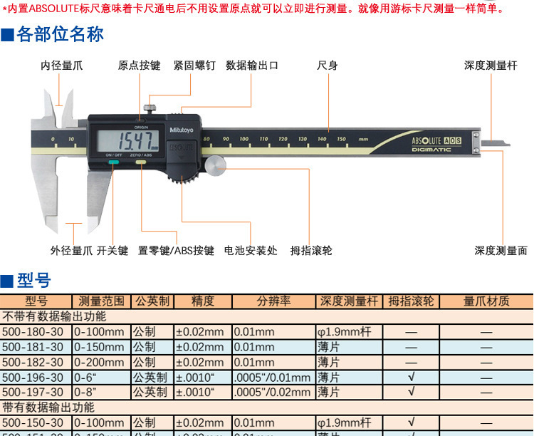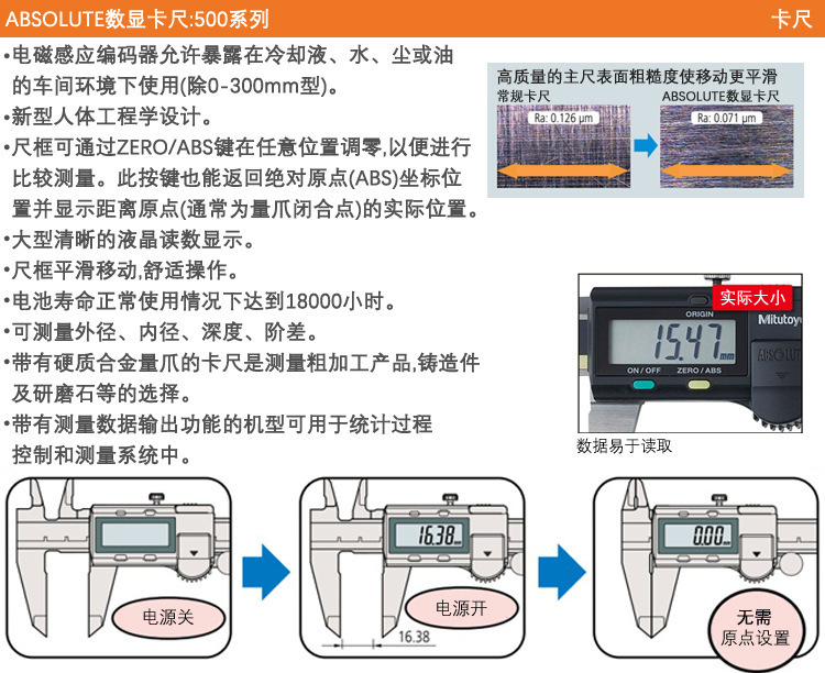 三丰原点型 Digimatic 卡尺品。它可对所设置的原点位置进行持续跟踪。开机液晶显示屏会显示出当前副尺位置,以便随时进行测量。采用ABS编码器技术,无需反复调零,也不会产生超速错误。