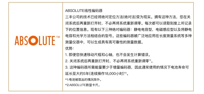 ● 内置拥有绝对原点的ABSOLUTE标尺的数显大量程卡尺。