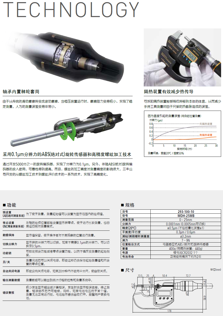 ● 本款千分尺分辨力为0.1μm,是需要用手持式工具进行高精度测量顾客的理想选择。