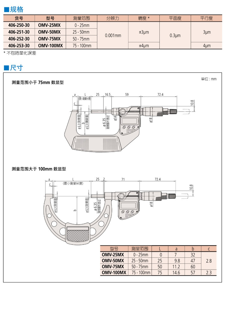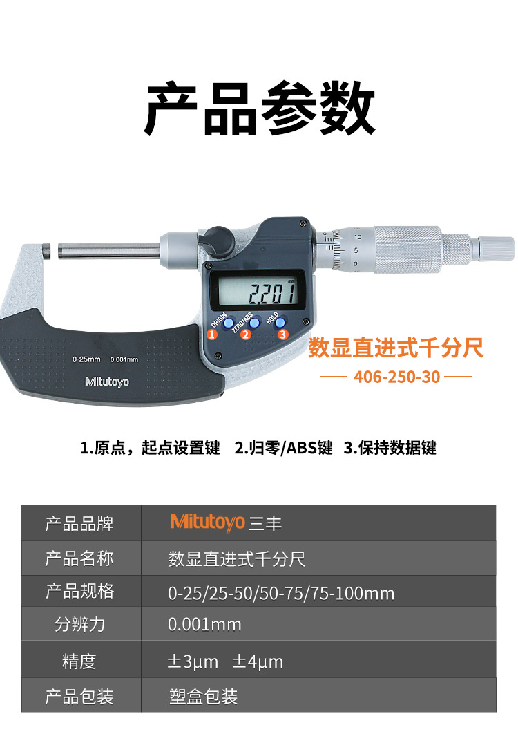 分辨率:0.001mm,.00005"/0.001mm(小于4")或.0001"/0.001mm(大于4")