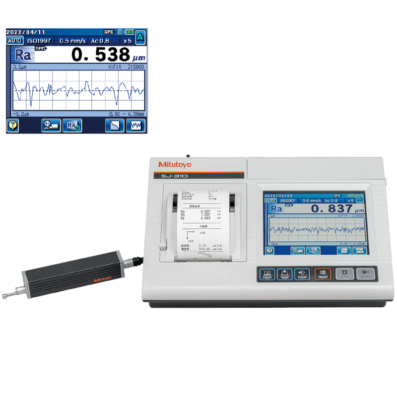 三丰Mitutoyo SJ-410粗糙度仪---能够适用在检测室、加工车间、生产现场等场合Surftest (表面粗糙度测量仪) 。SJ410系列粗糙度仪支持有轨和无轨两种测量。配备46个符合新的ISO、DIN、ANSI、JIS标准的粗糙度参数。配备一个宽范围、高分辨率的检出器和一个驱动器,提供了在同类产品中的测量。(测量范围/分辨率>800µm/0.0125µm分辨率 (8µm测量范围) <直线度/移动长度 ) sj-411驱动部 : 0.3µm/25mm,sj-412驱动部:0.5µm/50mm。无轨检出器和弧形表面补偿功能使它能有效地评价圆柱体表面粗糙度。特细的阶差,直线度、波纹度均可用无轨测量功能测出。手持便携式数据处理单元和5.7英寸彩色图形lcd触摸面板,提供可读性和可操作性。LCD还具有背光功能,提高了黑暗环境中的可见度。测量数据可通过RS-232C接口电缆 (选件) 由外部PC输出。