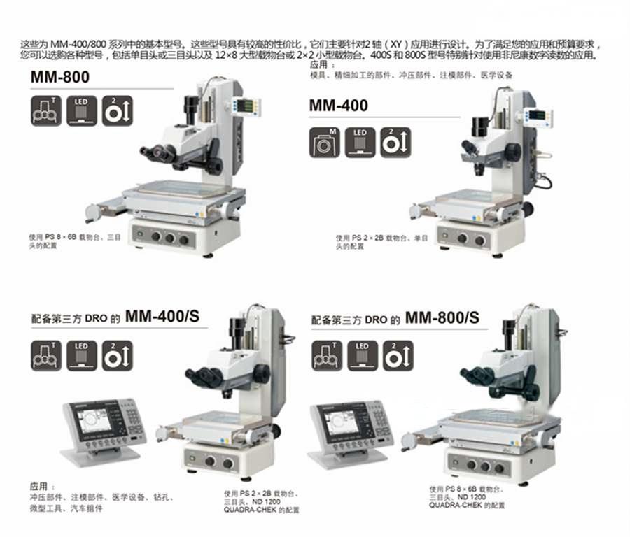 MM-800型广泛采用LED照明,计数器有两轴和三轴可选,根据镜筒、照明装置、升降机构、物镜,以及对焦机构的选择不同,有M、T、LT、LMT、LFA、LMFA、U、LU、LMU等多种子型号可供用户选择。可搭载尼康的12X8型测量载物台。该载物台的行程为300(X)×200(Y)mm,承载能力达 20Kg;