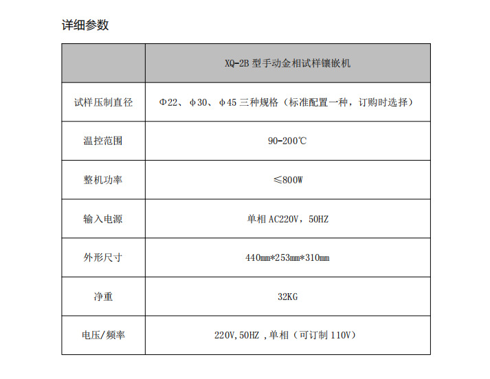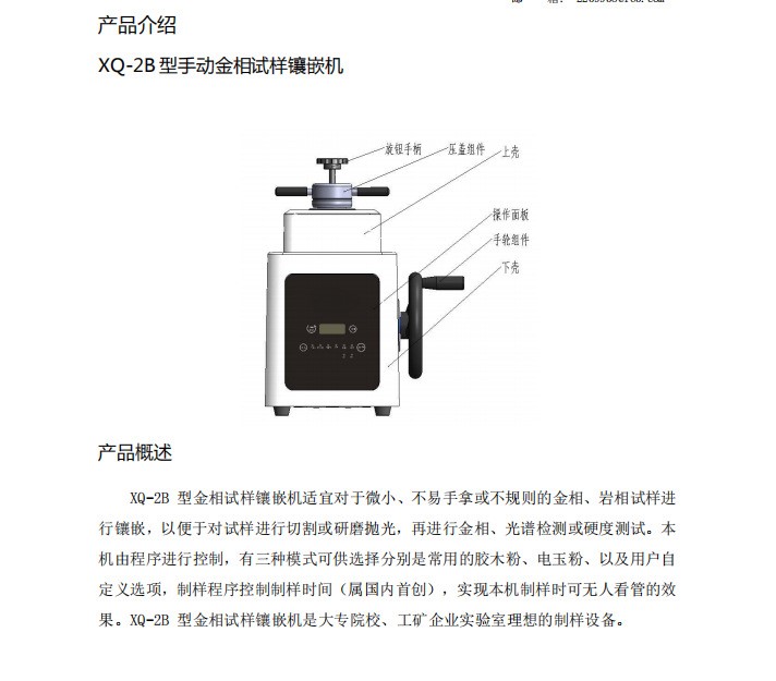 XQ-2B型金相试样镶嵌机适宜对于微小、不易手拿或不规则的金相、岩相试样进行镶嵌,以便于对试样进行切割或研磨抛光,再进行金相、光谱检测或硬度测试。本机由程序进行控制,有三种模式可供选择分别是常用的胶木粉、电玉粉、以及用户自定义选项,制样程序控制制样时间,实现本机制样时可无人看管的效果。XQ-2B型金相试样镶嵌机是大专院校、工矿企业实验室理想的制样设备。