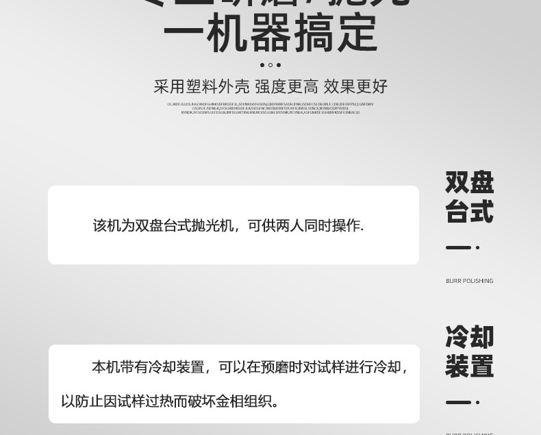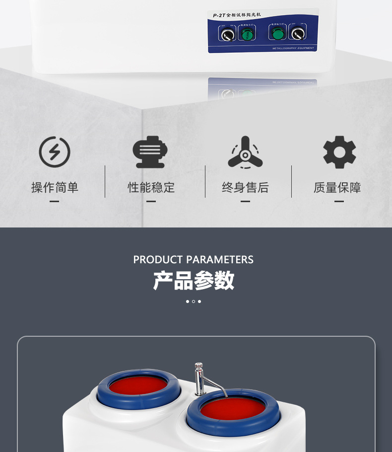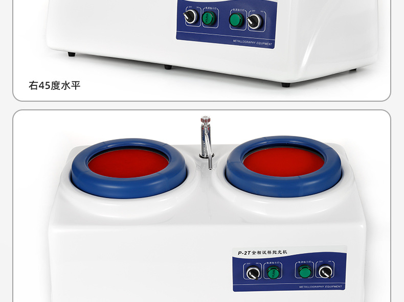 在金相试样制备过程中,试样的抛光是一道主要工序,经过磨光的试样,在抛光机上抛光后,可获得光亮如镜的表面,P-2T型金相试样抛光机是一款经典的抛光设备,它具有传动平稳,噪音小,操作、维修方便等优点,能适合更多种材料的抛光要求。该机适用于厂矿企业、大专院校、科研单位的金相试验室。